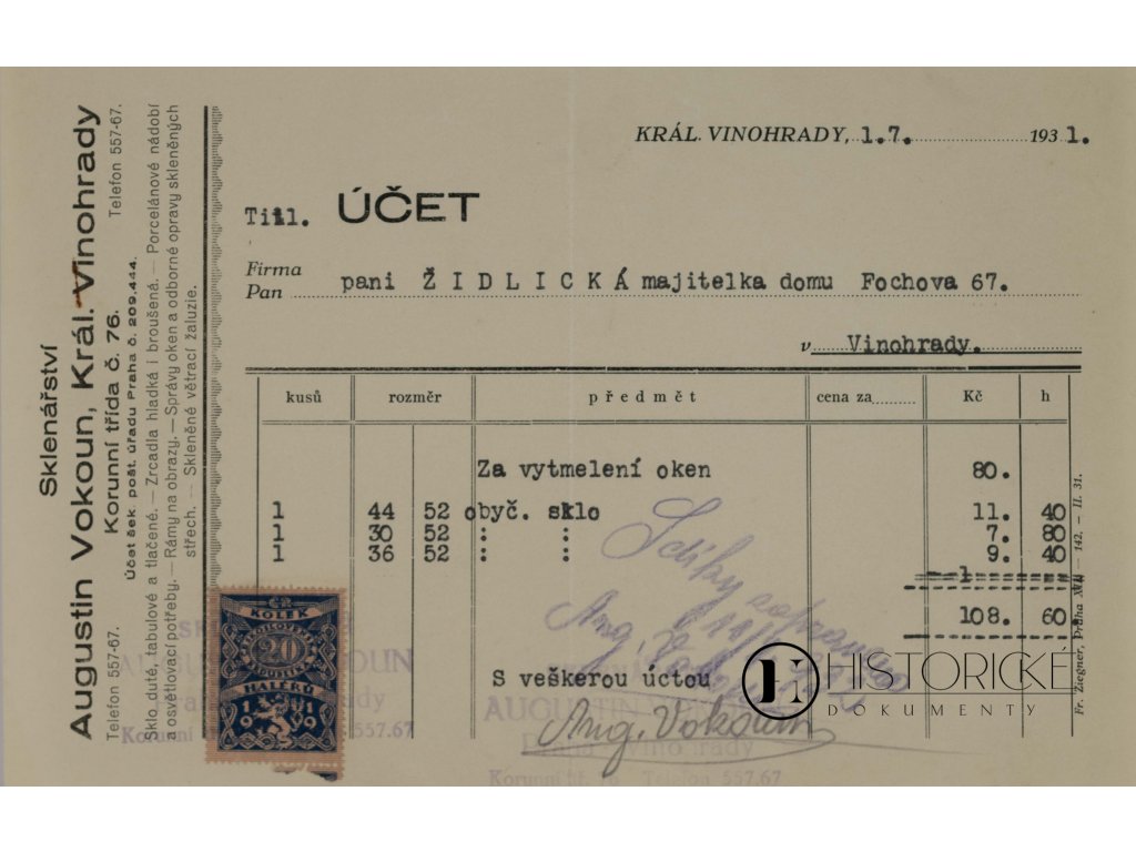 Účetní listina z dílny mistra Augustina Vokouna, sklenáře a leptače skla na Královských Vinohradech, vystavená dne 1. Srpna léta 1931. Dokument psán jest rukou a opatřen kolkem ve výši dvaceti haléřů. Řemeslo sklenářské a zvláště umění leptání skla náleželo k živnostem uměleckým, jimiž Vinohrady, čtvrť měšťanská a zámožná, oplývaly. Leptané sklo zdobívalo dveře vil, výkladce obchodů i okna kaváren proslulých. Mistr Vokoun tvořil ornamenty jemné i nápisy ozdobné technikou, jež trpělivosti a zručnosti vyžadovala. Vzácný doklad uměleckého řemesla sklenářského v dobách první republiky Československé