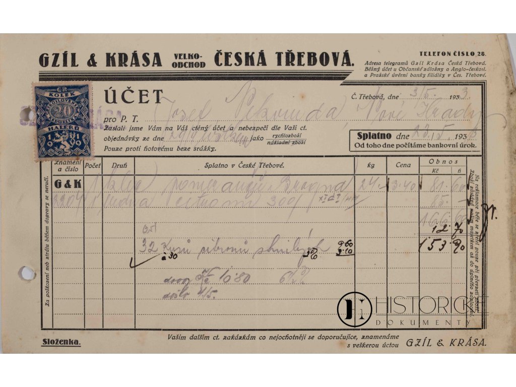 Účet Gzíl & Krása, Č. Třebová, 1933