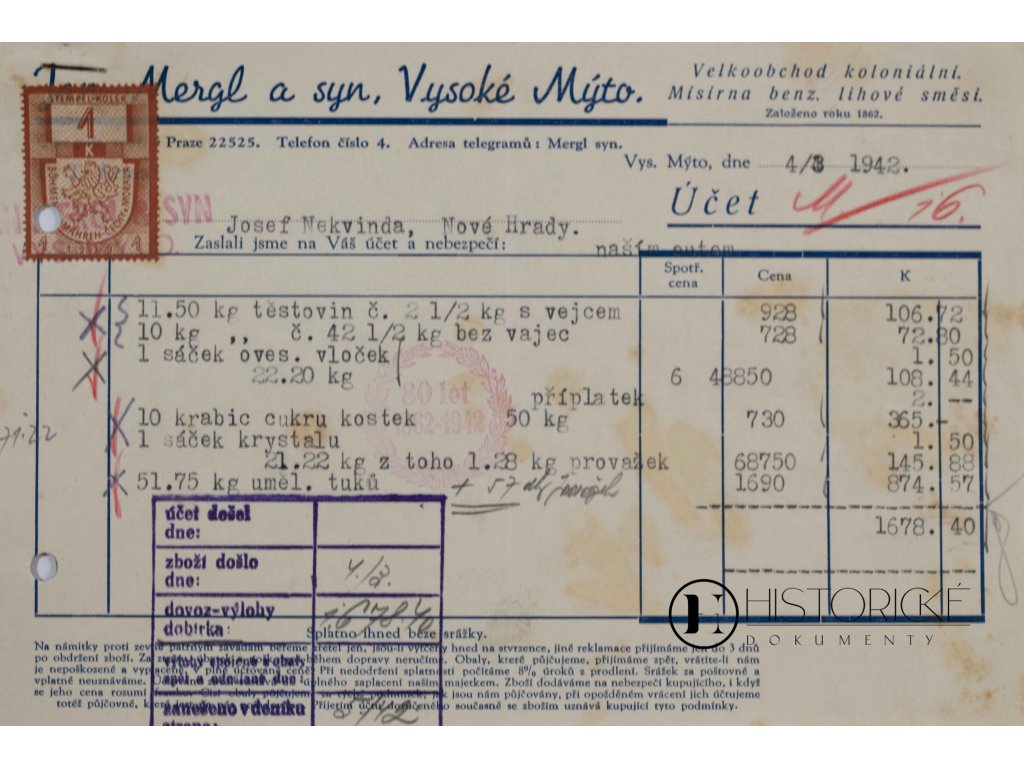 Račte pohlédnouti na účetní listinu z časů protektorátních, již vystavila slovutná firma Jan Mergl a syn z Vysokého Mýta, velkoobchod koloniálním zbožím a mísírna benzinových i lihových směsí. Dokument psán jest strojem dne 4. Března léta 1942, čítá dva listy a opatřen jest kolkem v hodnotě jedné koruny. Účet tento podává svědectví o obchodním životě v dobách nejtěžších, kdy národ náš pod jařmem okupantů trpěl. Firma Merglova náležela k významným podnikům východočeského kraje. Vzácná památka pro sběratele hospodářských dokumentů i badatele v dějinách obchodu českého za druhé války světové.
