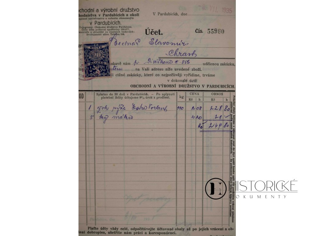 Účet Obchodního a výrobního družstva v Pardubicích z roku 1935, číslo 33960, opatřený kolkem v hodnotě 10 haléřů. Dokument jest nadepsán perem a opatřen razítkem družstva. Účet obsahuje 3 listy včetně potvrzení a představuje autentický historický pramen z oblasti družstevnictví v meziválečné Československé republice. Jedná se o vzácný dokument hospodářských dějin, jenž svědčí o fungování obchodních družstev ve třicátých letech. Neocenitelný materiál pro badatele družstevního hnutí a ekonomických dějin první republiky.