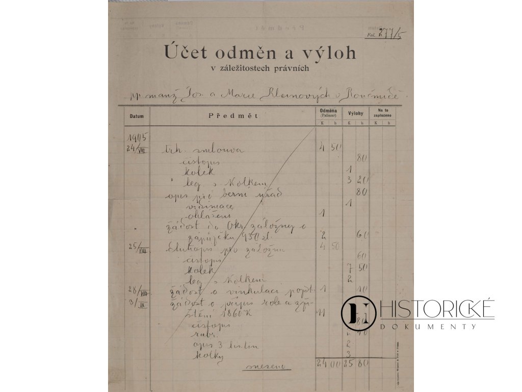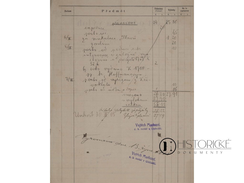 Účet odměn a výloh v záležitostech právních, jejž vystavil Vojtěch Markuzzi, c.k. notář v městě Unhošti, dne 24. srpna léta Páně 1905, za panování našeho císaře a krále Františka Josefa I. Notáři císařsko-královští náleželi k úředníkům váženým, jimž svěřovány byly věci nejdůležitější – závěti, smlouvy kupní, dědictví i ověřování listin rozličných. Pan Markuzzi, jménem původu vlaského, působil v Unhošti, městečku starobylém v kraji kladenském. Účet obsahuje vyčíslení palmáre notářského i útrat vedlejších za úkony právní vykonané. Vzácný doklad notářské praxe rakouské a právního života v zemích českých na počátku století dvacátého.