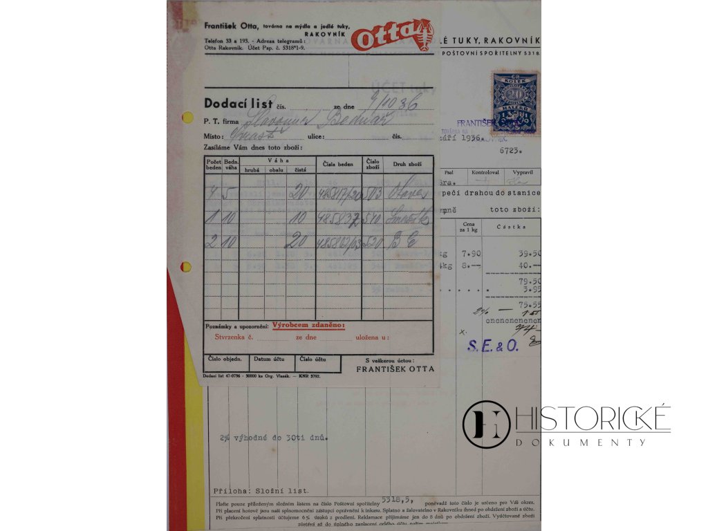 Účet Otta, tuky Rakovník, 1936