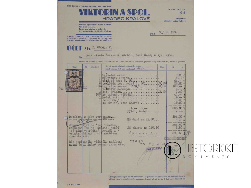 Účetní listina slovutné firmy Viktorin & spol. z královského města Hradce Králové, drogerie a velkoobchod materiální, vystavená dne 9. prosince léta 1939. Dokument zhotoven jest strojem písacím a opatřen kolkem v hodnotě padesáti haléřů protektorátních. Doba tato, první rok okupace německé, přinesla do obchodu českého nové pořádky i omezení mnohá. Drogerie a velkoobchody materiální zásobovaly lékárny, živnostníky i domácnosti zbožím rozličným, od léčiv po barvy a chemikálie. Hradec Králové, město průmyslné a obchodní, měl podnikatelů zdatných. Vzácný doklad obchodního života v počátcích Protektorátu Čechy a Morava