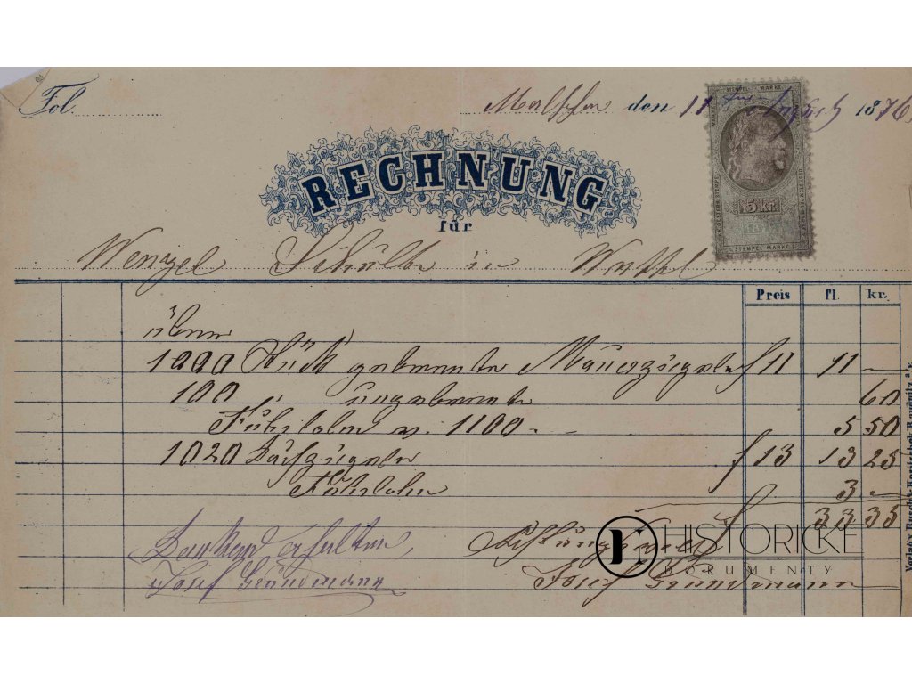 Dokument obsahuje řádky různých položek s cenami v rakouských zlatých a krejcarech, včetně zboží jako cukr, káva a další potraviny. Účet jest opatřen rakouskou kolkovou známkou s portrétem císaře Františka Josefa I. v hodnotě 5 krejcarů. Jedná se o autentický obchodní pramen z období Habsburské monarchie, jenž svědčí o obchodních praktikách a cenách zboží v 70. letech 19. století. Zajímavá památka rakouského obchodního života a finanční historie.