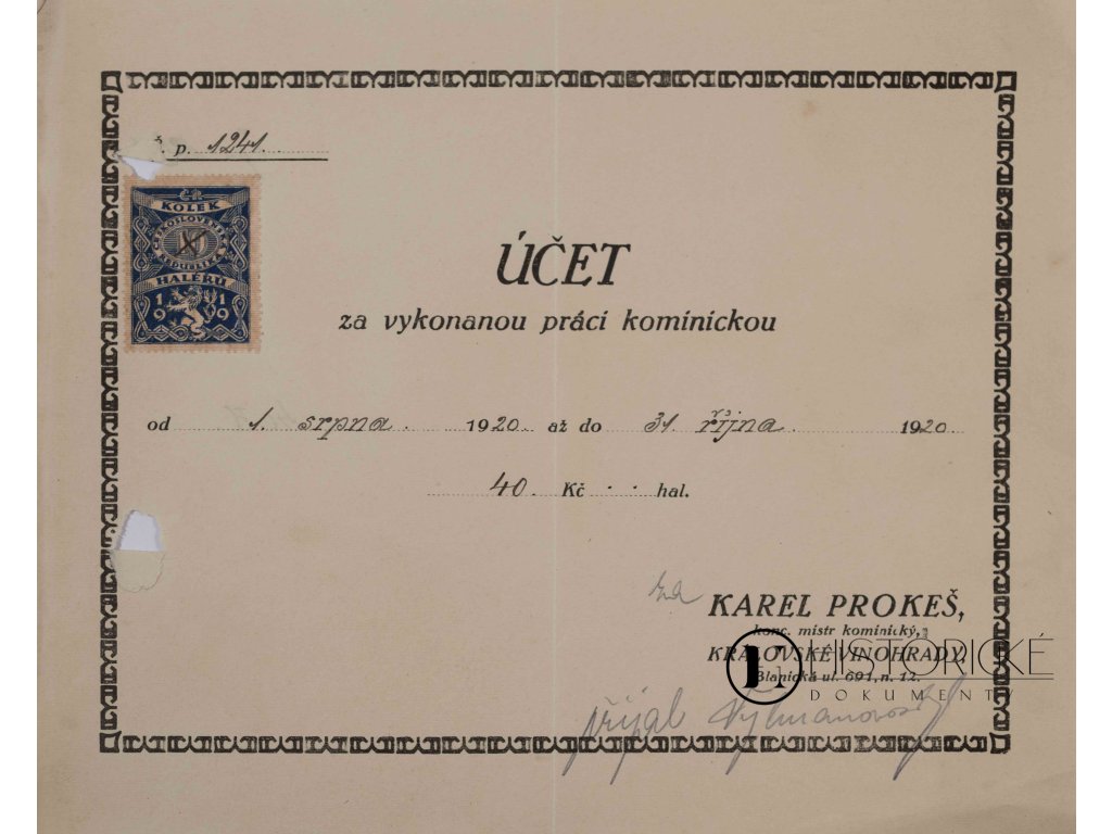 Účet za vykonanou práci kominickou, vystavený mistrem kominickým Karlem Prokešem z Královských Vinohrad, číslo popisné 1241. Účet zahrnuje období od 1. Srpna do 30. Října léta Páně 1920. Dokument opatřen kolkovou známkou v hodnotě 10 haléřů dle předpisů poplatkových republiky československé. Listina tato jest vzácným svědectvím řemesla kominického a obchodního styku v prvních letech státu československého. Zachovalost výtečná, písmo čitelné
