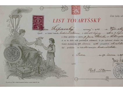 List Tovaryšský - hodinářství Litomyšl, 193. Opatřeno kolkem 1 K, razítko - Společenství hodinářů pražských. číslo: 182.