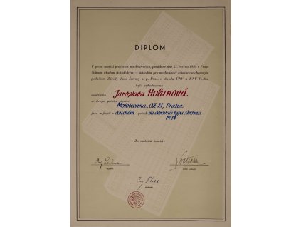 Diplom, soutěž pracovnic na děrovačích, Mototechna OZ 21, Praha pro soudružku děrující na děrovači typu Aritma M14, 1959. Razítko: Český úřad statistický.
