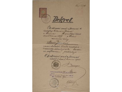 Dekret, C.k. Okresní soud Beroun k žádosti o propuštění (narození dcery), 2. Ledna, 1901. Razítka, kolek 30 heller (1898)