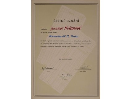 Čestné uznání, soutěž pracovnic na děrovačích, Mototechna OZ 21, Praha pro soudružku děrující na děrovači typu Aritma M14, 1959. Razítko: Český úřad statistický. Závody Jan...