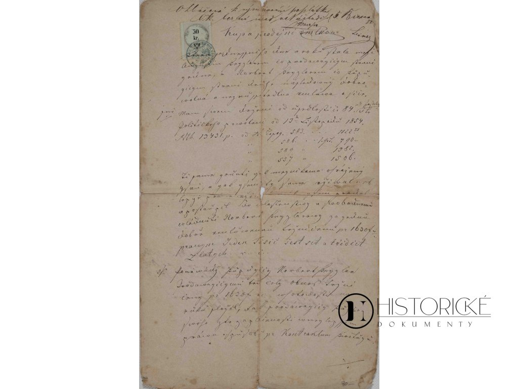 Listina obsahuje kolkovou známku 50 kr. (krejcarů) s razítkem úřadu zemského. Jedná se o prodejní smlouvu nemovitosti, kde se zmiňuje kupní cena a Galicijské povolení z různých let 1884, 1886 a 1887. Text vyhotoven v jazyce českém starém, s odkazy na různá nařízení a paragrafy tehdejších zákonů císařských. Dokument nese podpisy smluvních stran a svědků, spolu s úředními ověřeními. Papír má patinu času s lehkým zažloutnutím a stopami po přeložení, což jen podtrhuje jeho pravost a stáří. Jedinečná památka rakousko-uherské právní praxe a cenný doklad vlastnických vztahů z doby Františka Josefa I.