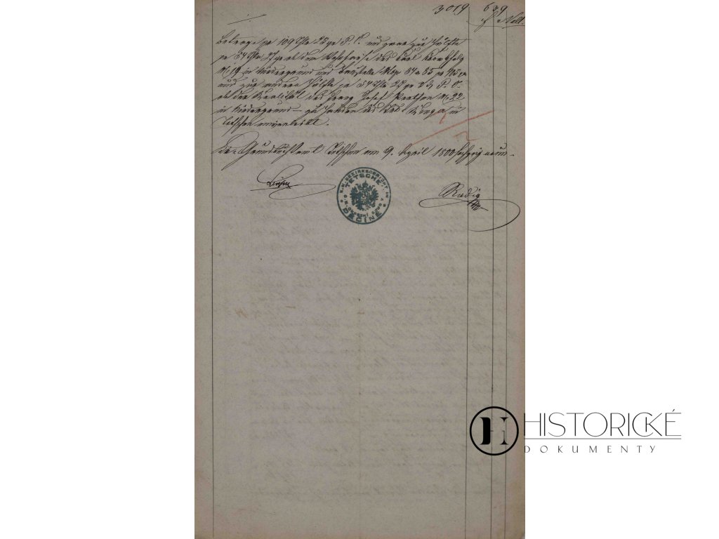 Listina jest s pečetí c. k. okresního hejtmanství v Teplicích-Šanově z konce 19. věku. Razítko modravé s orlem dvouhlavým habsburským a nápisem kruhovým "K.K. BEZIRKSHAUPTMANNSCHAFT TEPLITZ". Dokument psán kurrentem německým, obsahuje úřední záležitosti správní s podpisy úředníkův a parafami červenými. V pravém rohu horním číslo jednací 2019/629 s datací. List svědčí o fungování správy státní v krajině severočeské za časův mocnářství, kdy Teplice střediskem okresním důležitým bývaly. Cenná památka pro badatele v dějinách správních.