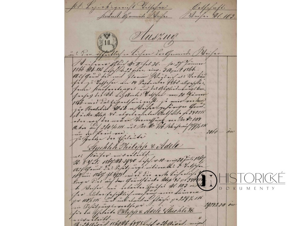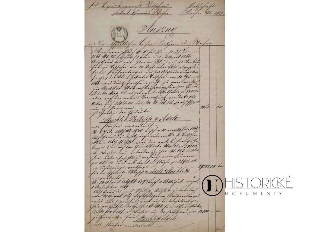 Nadepsáno "k. k. Eigenthümliche Giltshen" s lokací "Reichsase, Bleiße 21. 162". Soupis položek účetních obsahuje částky různé, mezi nimi "Hauslich Philipp & Adele" se sumami peněžními. Dokument podepsán úředníky více, datován v časech předválečných, těsně před bitvou u Sadové. List svědčí o správě finanční v dobách, kdy monarchie na vrcholu moci své tkvěla. Vzácná památka pro badatele hospodářských dějin císařství.