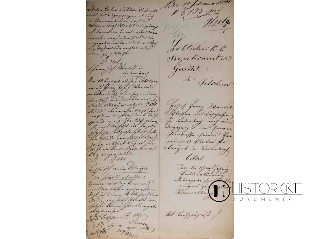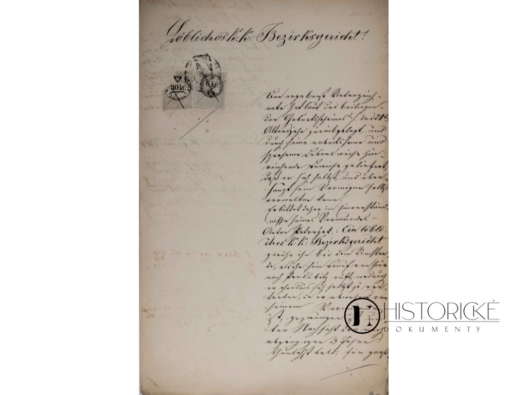 Úřední dokument Löbliches k.k. Bezirksgericht