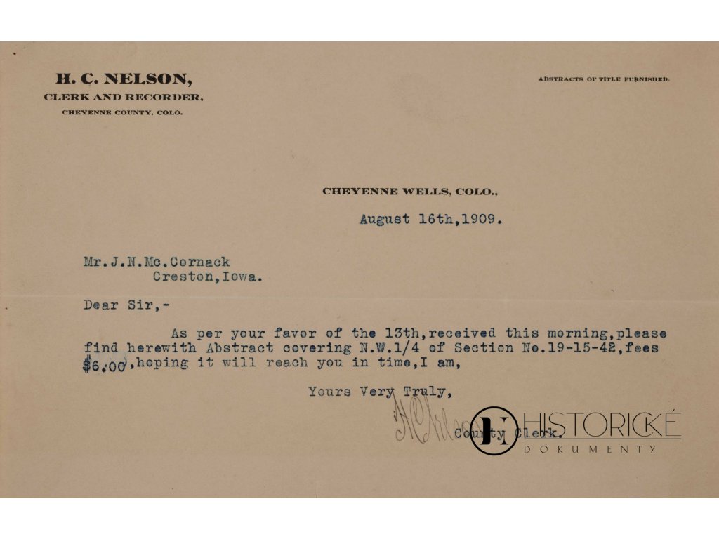 Dopis jest adresován panu J. N. McCormackovi v Crestonu, Iowa, a obsahuje informaci o zaslání výpisu vlastnického práva k pozemku N.W.1/4 sekce č. 19-15-42 za poplatek 6 dolarů. Nelson působil jako okresní úředník a zapisovatel poskytující abstrakty vlastnických práv. Jedná se o autentický historický dokument americké pozemkové administrativy počátku 20. století. Neocenitelný materiál pro badatele amerických právních a pozemkových dějin.