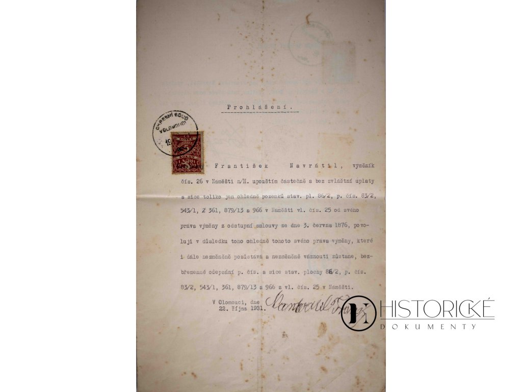 Úřední prohlášení před Okresním soudem v Olomouci ze dne 22. října léta Páně 1931, o čtyřech stranách zachované, razítkem úředním, dvěma kolky jednokorunovými a podpisem opatřené. Jest to dokument nadmíru cenný, poskytující vzácné svědectví o právní praxi první republiky a dokumentující činnost soudní v době meziválečné.
