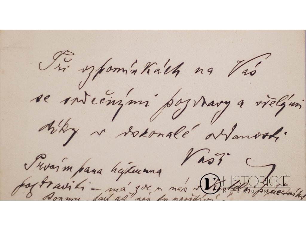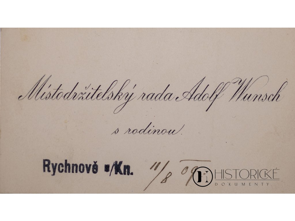 Vzácná společenská vizitka místodržitelského rady Adolfa Wunsche s rodinou z Rychnova nad Kněžnou, datovaná 10. srpna léta Páně 1909. Na rubu jest vlastnoručně připsaný text perem. Tento dokument představuje cenné svědectví o společenském postavení a zvyklostech státních úředníků v období rakousko-uherské monarchie. Jest významným dokladem o působení místodržitelské správy v regionech českých zemí.