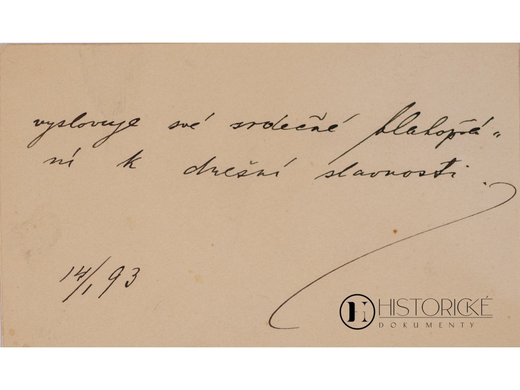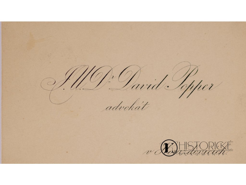 Vizitka významného horažďovického advokáta JUDr. Davida Poppera z konce 19. století. Na rubu této společenské tiskoviny jest vlastnoručně připsáno blahopřání k slavnosti z roku 1893. Tento dokument představuje cenné svědectví o společenském životě židovské inteligence v českých zemích za Rakouska-Uherska. Vizitka dokládá význam právnického stavu v maloměstském prostředí a společenské zvyklosti tehdejší doby.