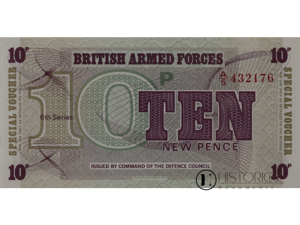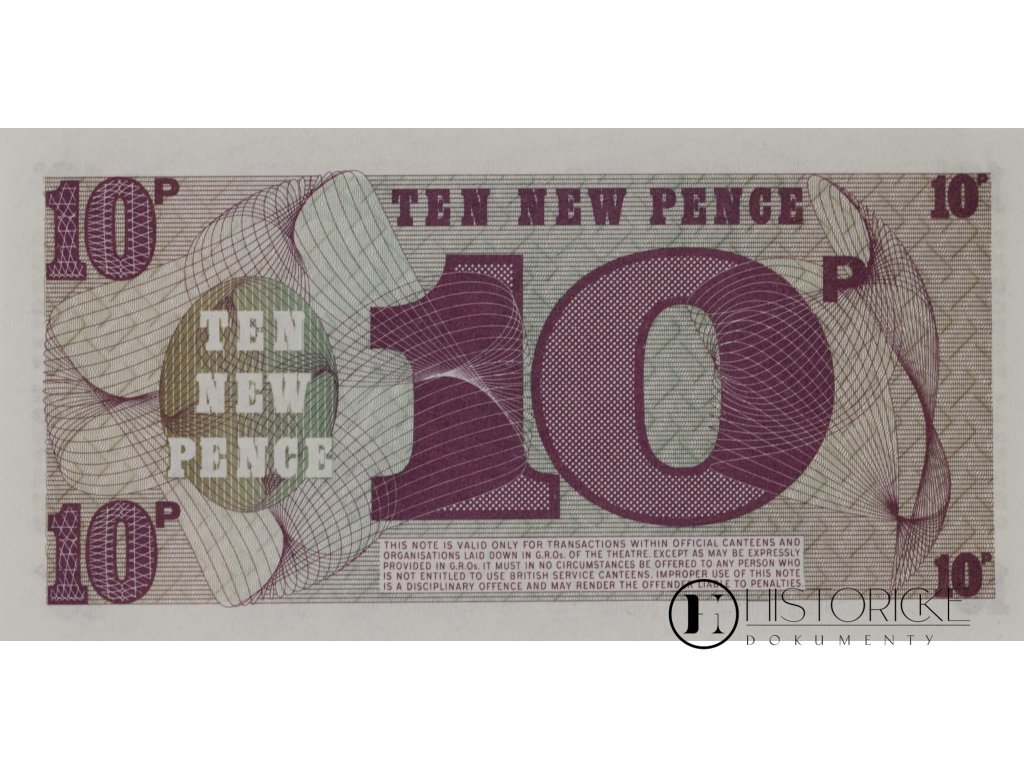 Vojenská poukázka v hodnotě 10 nových pencí vydaná Britskými ozbrojenými silami v roce 1972 na základě pověření Obranné rady. Jedná se o speciální platební poukaz 6. série určený výhradně pro transakce ve vojenských kantýnách a oficiálních organizacích. Obsahuje přesné instrukce pro použití a upozornění na disciplinární následky při nesprávném užití. Poukázka pochází z období vlády královny Alžběty II.