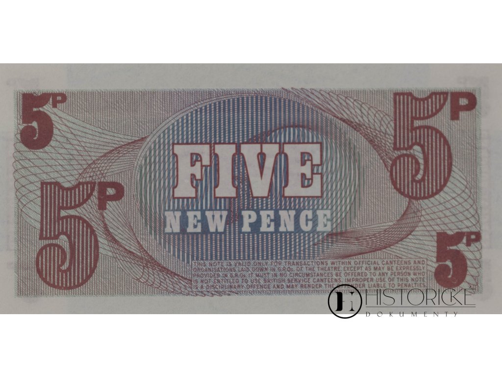 Vojenská poukázka v hodnotě 5 nových pencí vydaná Britskými ozbrojenými silami v roce 1972 na základě pověření Obranné rady. Jedná se o speciální platební poukaz 6. série určený výhradně pro transakce ve vojenských kantýnách a oficiálních organizacích. Obsahuje přesné instrukce pro použití a upozornění na disciplinární následky při nesprávném užití. Poukázka pochází z období vlády královny Alžběty II.