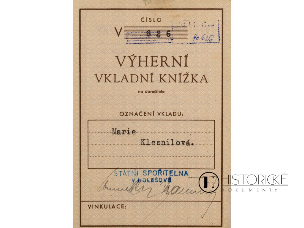 Výherní vkladní knížka Státní spořitelny v Praze 5, číslo 626, 40.626, z léta Páně 1955 pocházející. Jest to dokument nadmíru cenný, dokumentující specifickou formu spoření v době socialistické. Artefakt tento poskytuje vzácné svědectví o snaze státu podporovati spořivost obyvatelstva formou prémiového spoření s možností výhry.