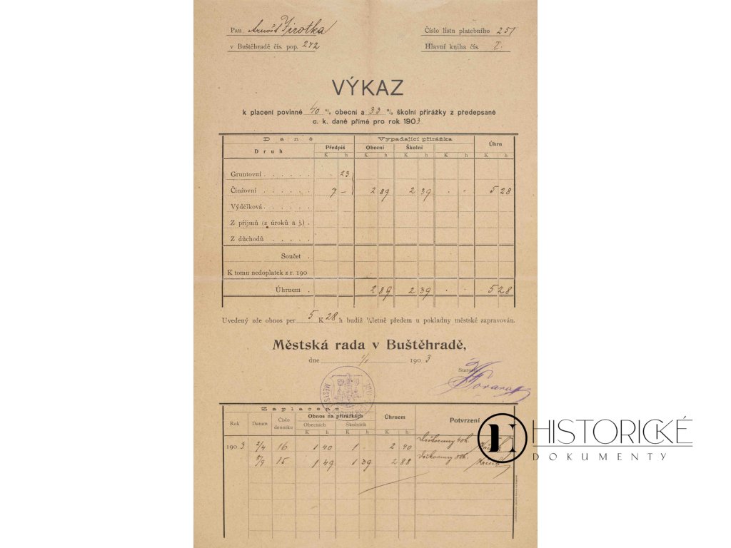 Úřední výkaz k placení povinné obecní přirážky ve výši 40% a školní přirážky ve výši 33% z veškerých předepsaných daní pro rok 1903, vydaný v Buštěhradě. Dokument tento opatřen jest razítkem Městské rady buštěhradské a vlastnoručním podpisem úředním. Listina svědčí o daňové soustavě v dobách monarchie rakousko-uherské, kdy obce vybíraly přirážky k daním státním pro potřeby obecní správy a školství. Stav zachovalosti výtečný. Pro sběratele dokumentů historických i badatele dějin správy obecní artefakt nevšední hodnoty