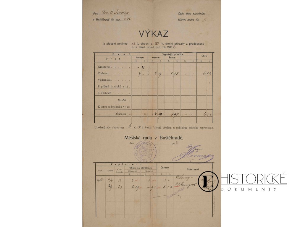 Úřední výkaz k placení povinné obecní přirážky ve výši 58% a školní přirážky ve výši 27% z veškerých předepsaných daní pro rok 1905, vydaný v Buštěhradě. Dokument tento opatřen jest razítkem Městské rady buštěhradské a vlastnoručním podpisem úředním. Listina svědčí o daňové soustavě v dobách monarchie rakousko-uherské, kdy obce vybíraly přirážky k daním státním pro potřeby obecní správy a školství. Stav zachovalosti výtečný. Pro sběratele dokumentů historických i badatele dějin správy obecní artefakt nevšední hodnoty