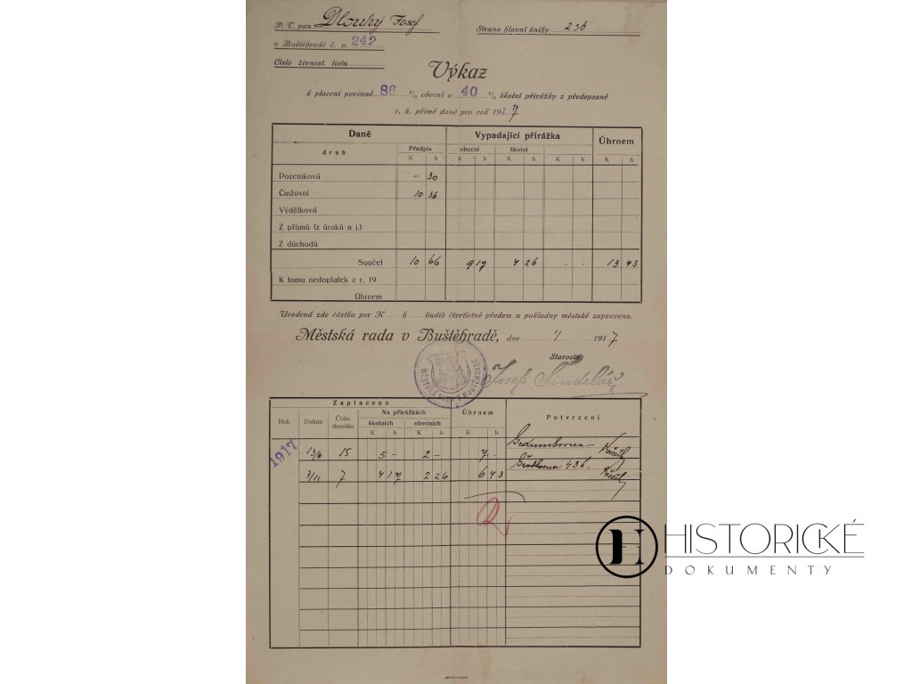 Úřední výkaz k placení povinné obecní přirážky ve výši 80% a školní přirážky ve výši 40% z veškerých předepsaných daní pro rok 1917, vydaný v Buštěhradě. Dokument tento opatřen jest razítkem Městské rady buštěhradské a vlastnoručním podpisem úředním. Listina svědčí o daňové soustavě v dobách monarchie rakousko-uherské, kdy obce vybíraly přirážky k daním státním pro potřeby obecní správy a školství. Stav zachovalosti výtečný. Pro sběratele dokumentů historických i badatele dějin správy obecní artefakt nevšední hodnoty