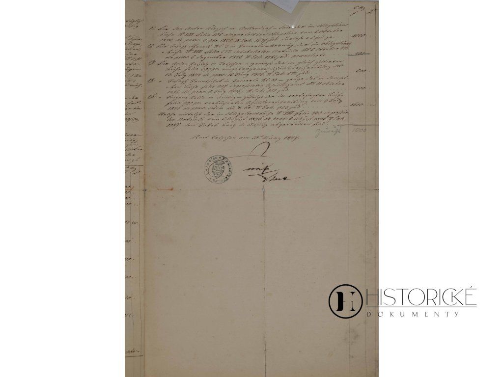 Na čtyřech listech opatřený úředním razítkem a podpisem příslušného úřadu. Listina o dvou stranách podrobně zachycuje zástavní pohledávky a věcná břemena váznoucí na usedlosti, včetně obligací v hodnotách 1000, 200, 600, 400 a 1600 zlatých konvenční mince, vázaných na různé věřitele z okolních obcí. Dokument jest opatřen kolkovým otiskem 15 krejcarů a jest vzácným svědectvím o pozemkovém a zástavním právu Dolních Rakous v předbřeznové době. Stav listiny velmi dobrý.