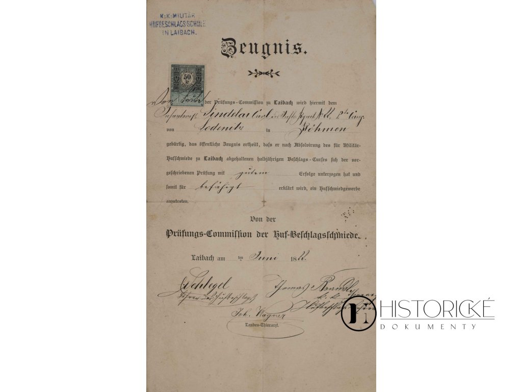 Dokument osvědčuje, že pěšák Šindelář Carl z Loděnic v Čechách absolvoval půlroční kurs podkovářský a složil zkoušku s prospěchem dobrým, čímž oprávněn jest živnost podkovářskou provozovati. Listina opatřena jest kolkem padesáti krejcarů a podpisy členů zkušební komise včetně zemského zvěrolékaře Johanna Wagnera. Lublaň slovinská hostila školu vojenskou, kde vojáci péči o kopyta koní jezdeckých se učili. Vzácná památka na vojenské školství rakouské a řemeslo podkovářské za císaře Františka Josefa I.