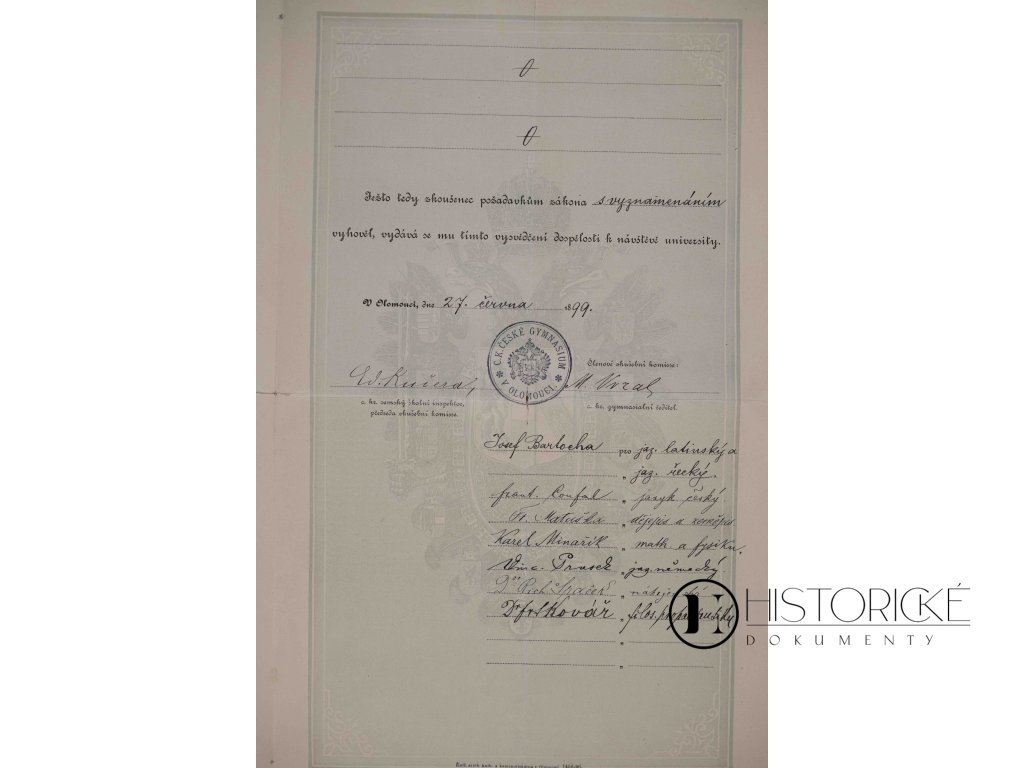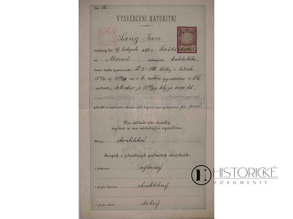 Maturitní vysvědčení z Hoštic na Moravě z roku 1899, číslo 10, opatřené kolkem v hodnotě 2 koruny a razítkem školy. Dokument obsahuje 4 listy a představuje autentický historický pramen z oblasti středního školství z konce 20. století. Jedná se o vzácnou památku československého a později českého vzdělávacího systému z přelomu tisíciletí. Vysvědčení svědčí o fungování středoškolské administrativy v posledním roce 20. století. Neocenitelný materiál pro badatele dějin českého školství a genealogického bádání. Výtečný dokument z období demokratizace vzdělávání.