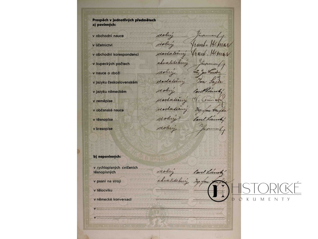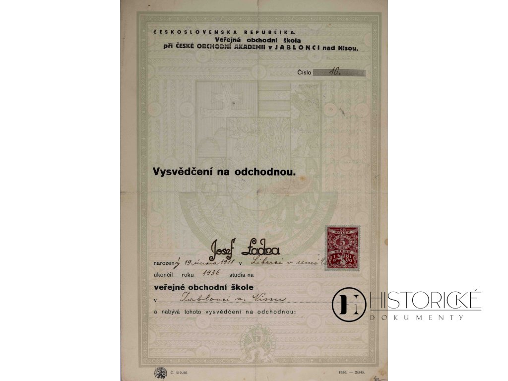 Vysvědčení na odchodnou z Veřejné obchodní školy při České obchodní akademii v Jablonci nad Nisou z roku 1938, opatřené číslem 10. Dokument obsahuje čtyři listy a jest opatřen kolkem v hodnotě 5 korun československých spolu s úředním razítkem školy. Tento exemplář pochází z posledního roku svobodného Československa před okupací a představuje autentický doklad vzdělanosti a kvalifikace v obchodním odvětví. Vysvědčení svědčí o vysoké úrovni československého školství a jest cenným artefaktem pedagogických dějin předválečné éry, kdy se kladl důraz na praktické obchodní vzdělání mladých lidí.