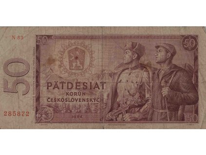 Bankovka 50 Kčs, N 83, číslo: 285572, 1964. Republika Československá, státovka. Vyobrazen: sovětský voják a partyzán na pozadí hor/petrochemický závod Slovnaft Bratislava....