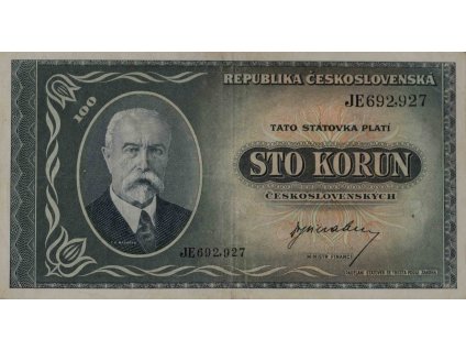 Státovka, 100 Korun. JE, číslo: 692,927. Republika Československá. Vyobrazen T. G. Masaryk a Hradčany. Londýnská emise. Autor: Bedřich Feigl, ateliér...