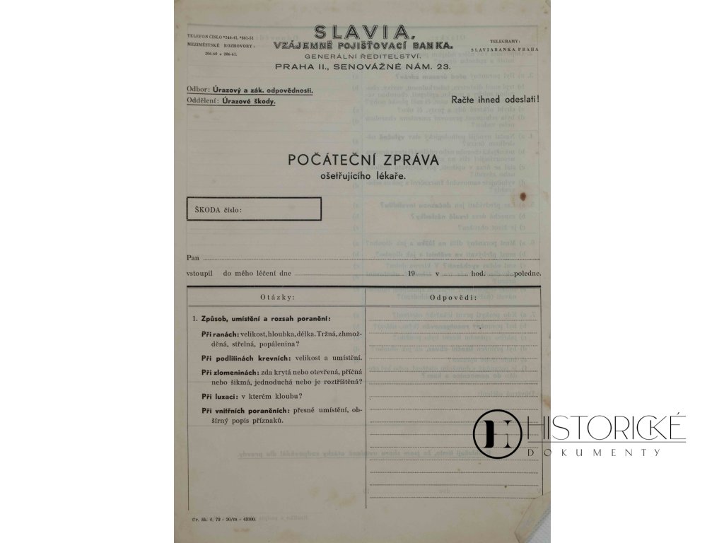 Počáteční zpráva ošetřujícího lékaře pro rizika úrazová, vydaná vzájemně pojišťovací bankou Slavia. Tento historický dokument sloužil k zaznamenání úrazů a zdravotních problémů zaměstnanců za účelem pojišťovacího krytí. Vzájemně pojišťovací banka Slavia byla významnou institucí poskytující sociální a úrazové pojištění v meziválečném Československu. Lékařské zprávy takového typu byly nezbytné pro vyřizování pojistných nároků a dokumentaci pracovních úrazů. Dokument psán byl na officiálním tiskopise s razítky a podpisy lékařů. Pro sběratele pojišťovacích dokumentů a badatele o dějinách sociálního pojištění představuje vzácné svědectví o péči o zdraví zaměstnanců a fungování pojišťovnictví v První republice. Autentická památka na počátky moderního sociálního systému.